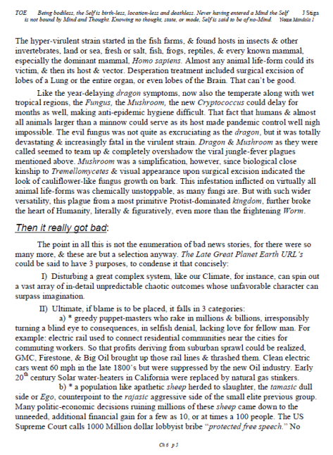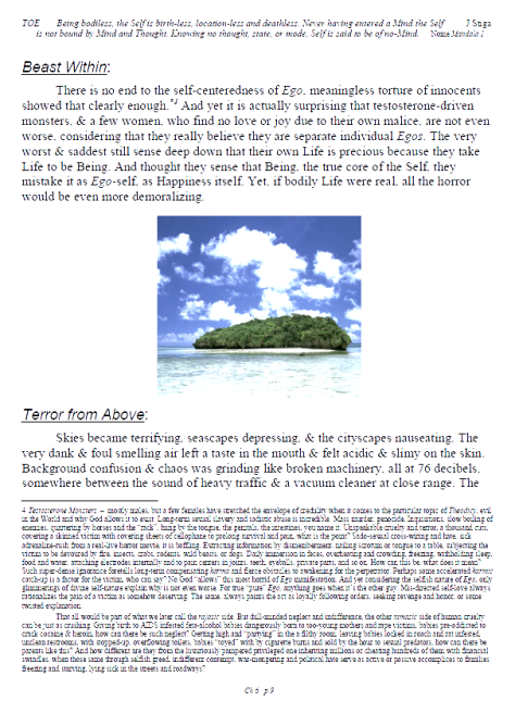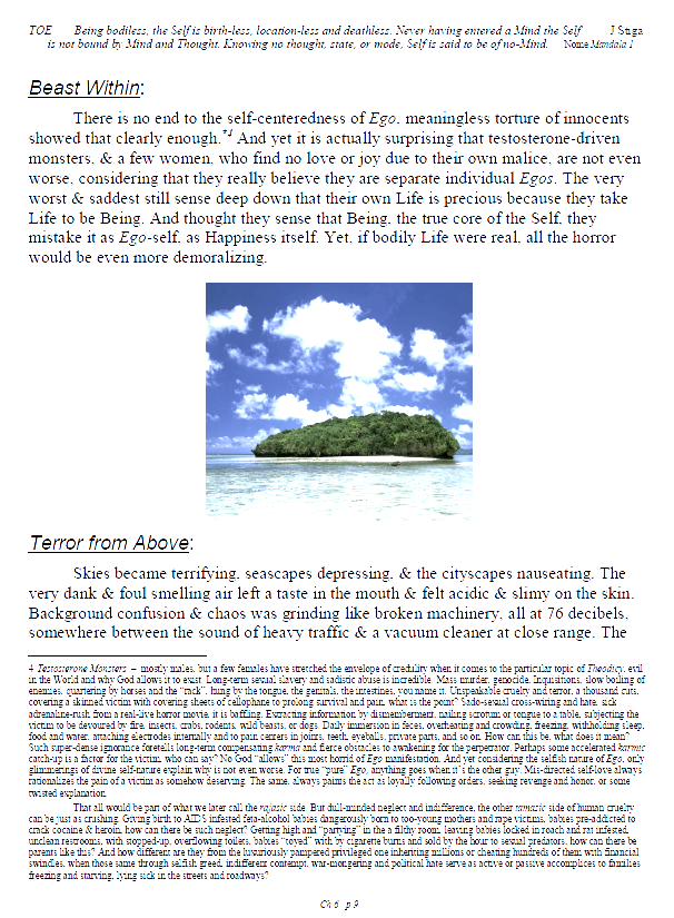 [A brief note of explanation – this Blog is entitled “Non-Duality & Science”, & so the more Science oriented pages (from what I like to think of as a “comic book”) have been posted there, while other chapters have been posted in the other Blog noted below. Science is a mental discipline that attracts some worthy admirers & participators. Some of these, too few, are good prospects for the ancient teaching introduced here in many ways. Otherwise certain Science topics like the Anthropic Principle, reinforce the general Theism which is a good idea in this materialistic age. A few other topics in Science, such as the Copenhagen II – Max Born – Von Neumann – Wigner model of Quantum Mechanics, are worthy entries to the extent that they introduce Consciousness into the physical Sciences. All that aside, the real topic here is the pinnacle as Advaita Vedanta, Non-Duality – that pinnacle being Ajata Vada, No–Creation. The great Teachers of the same include Sri Shankara & Sri Ramana Maharshi. Both would support Theism in general & adaptations of Vedanta, such as Vishishtadvaita Vedanta – Qualified Non-Duality, for those not making headway in Ajata Vada, their present course of growth might be better served with a temporary involvement in Qualified Non-Duality. The scientist who perhaps best expresses the influence of Qualified Non-Duality in Science, for instance, would be the quintessential “New–Age” Quantum Physicist, Amit Goswami. And so to that source, & the Quantum Activism he currently advocates [with a 1–course degree program], along with more than a half-dozen good books & former participation in the controversial What the Bleep movie, to him I extend enthusiastic endorsement, for that Qualified Non-Duality described in the context of Science. I do not stand so much “with him”, as much as nearby saluting his good work. Again, as here, a goal is inserting Consciousness into Science & “saving the World.”]