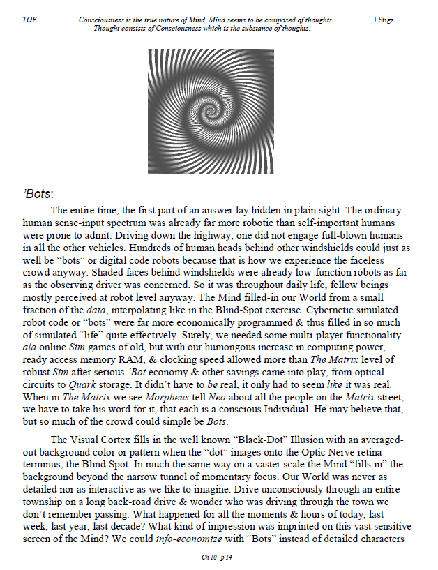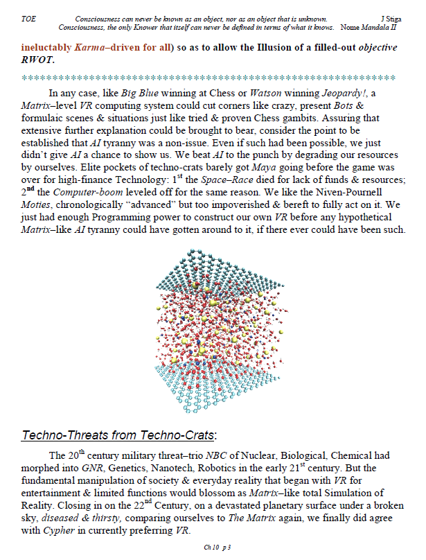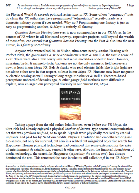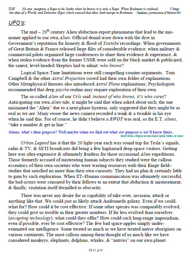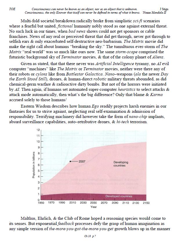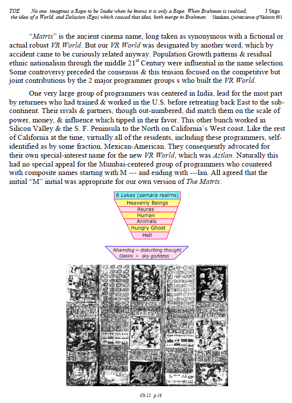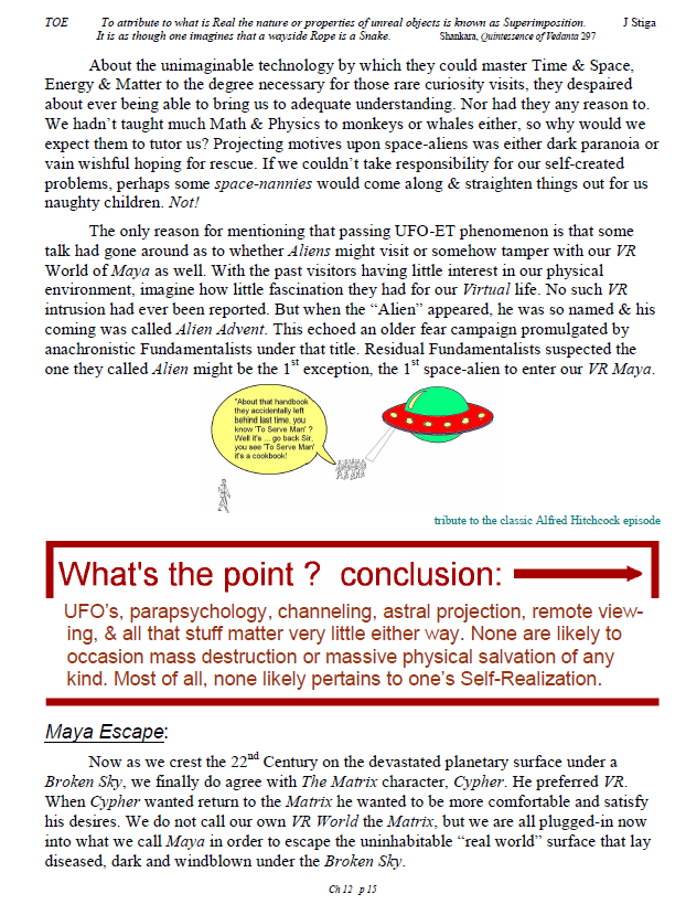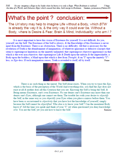 [A brief note of explanation – this Blog is entitled “Non-Duality & Science”, & so the more Science oriented pages (from what I like to think of as a “comic book”) have been posted there, while other chapters have been posted in the other Blog noted below. Science is a mental discipline that attracts some worthy admirers & participators. Some of these, too few, are good prospects for the ancient teaching introduced here in many ways. Otherwise certain Science topics like the Anthropic Principle, reinforce the general Theism which is a good idea in this materialistic age. A few other topics in Science, such as the Copenhagen II – Max Born – Von Neumann – Wigner model of Quantum Mechanics, are worthy entries to the extent that they introduce Consciousness into the physical Sciences. All that aside, the real topic here is the pinnacle as Advaita Vedanta, Non-Duality – that pinnacle being Ajata Vada, No–Creation. The great Teachers of the same include Sri Shankara & Sri Ramana Maharshi. Both would support Theism in general & adaptations of Vedanta, such as Vishishtadvaita Vedanta – Qualified Non-Duality, for those not making headway in Ajata Vada, their present course of growth might be better served with a temporary involvement in Qualified Non-Duality. The scientist who perhaps best expresses the influence of Qualified Non-Duality in Science, for instance, would be the quintessential “New–Age” Quantum Physicist, Amit Goswami. And so to that source, & the Quantum Activism he currently advocates [with a 1–course degree program], along with more than a half-dozen good books & former participation in the controversial What the Bleep movie, to him I extend enthusiastic endorsement, for that Qualified Non-Duality described in the context of Science. I do not stand so much “with him”, as much as nearby saluting his good work. Again, as here, a goal is inserting Consciousness into Science & “saving the World.”]
