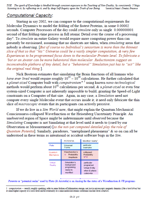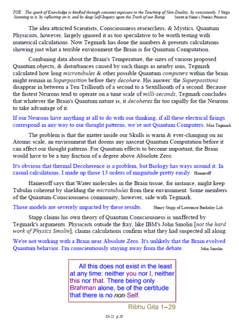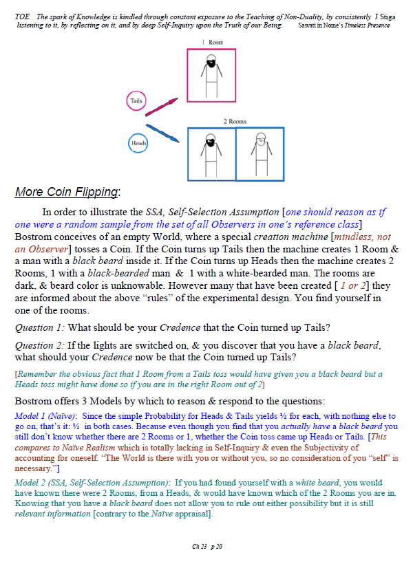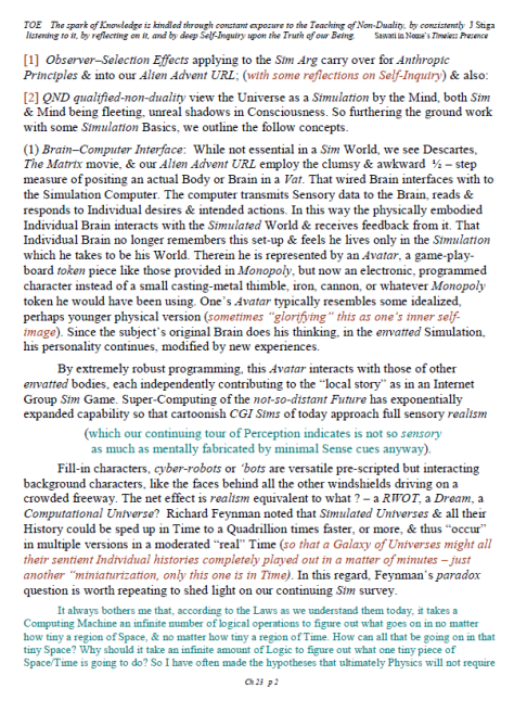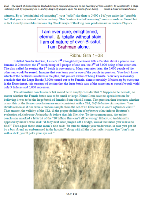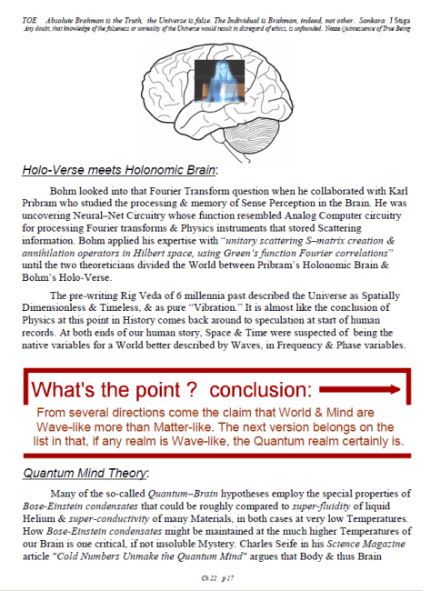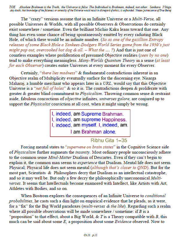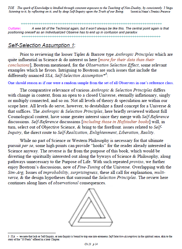 [A brief note of explanation – this Blog is entitled “Non-Duality & Science”, & so the more Science oriented pages (from what I like to think of as a “comic book”) have been posted there, while other chapters have been posted in the other Blog noted below. Science is a mental discipline that attracts some worthy admirers & participators. Some of these, too few, are good prospects for the ancient teaching introduced here in many ways. Otherwise certain Science topics like the Anthropic Principle, reinforce the general Theism which is a good idea in this materialistic age. A few other topics in Science, such as the Copenhagen II – Max Born – Von Neumann – Wigner model of Quantum Mechanics, are worthy entries to the extent that they introduce Consciousness into the physical Sciences. All that aside, the real topic here is the pinnacle as Advaita Vedanta, Non-Duality – that pinnacle being Ajata Vada, No–Creation. The great Teachers of the same include Sri Shankara & Sri Ramana Maharshi. Both would support Theism in general & adaptations of Vedanta, such as Vishishtadvaita Vedanta – Qualified Non-Duality, for those not making headway in Ajata Vada, their present course of growth might be better served with a temporary involvement in Qualified Non-Duality. The scientist who perhaps best expresses the influence of Qualified Non-Duality in Science, for instance, would be the quintessential “New–Age” Quantum Physicist, Amit Goswami. And so to that source, & the Quantum Activism he currently advocates [with a 1–course degree program], along with more than a half-dozen good books & former participation in the controversial What the Bleep movie, to him I extend enthusiastic endorsement, for that Qualified Non-Duality described in the context of Science. I do not stand so much “with him”, as much as nearby saluting his good work. Again, as here, a goal is inserting Consciousness into Science & “saving the World.”]