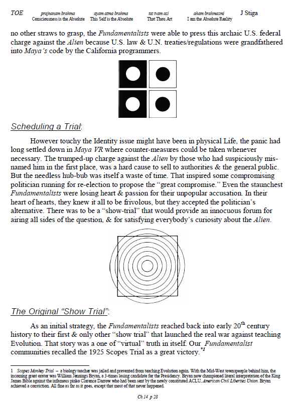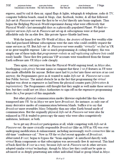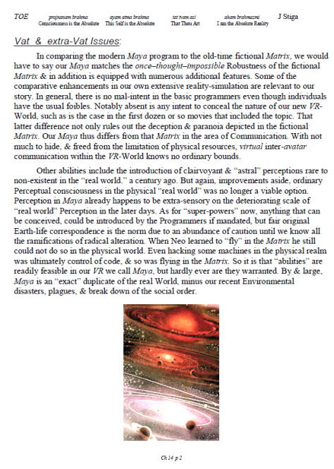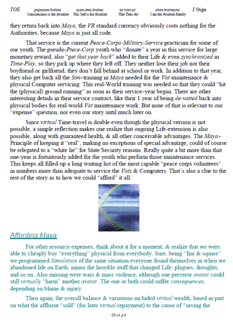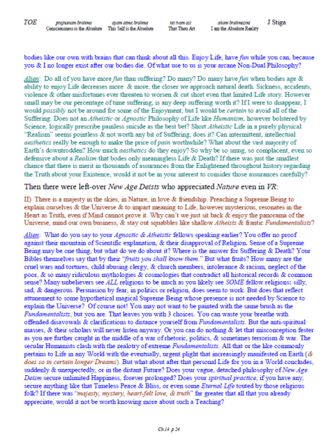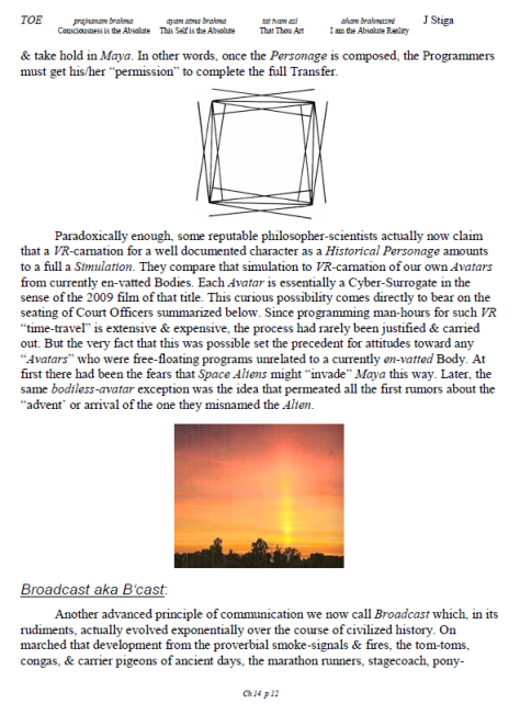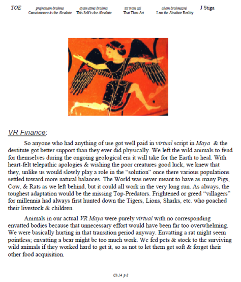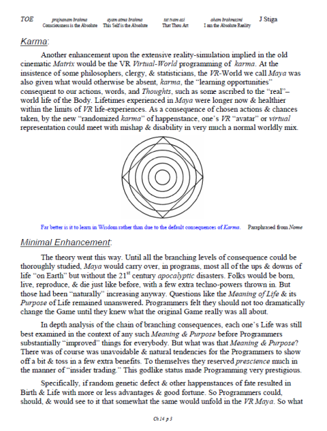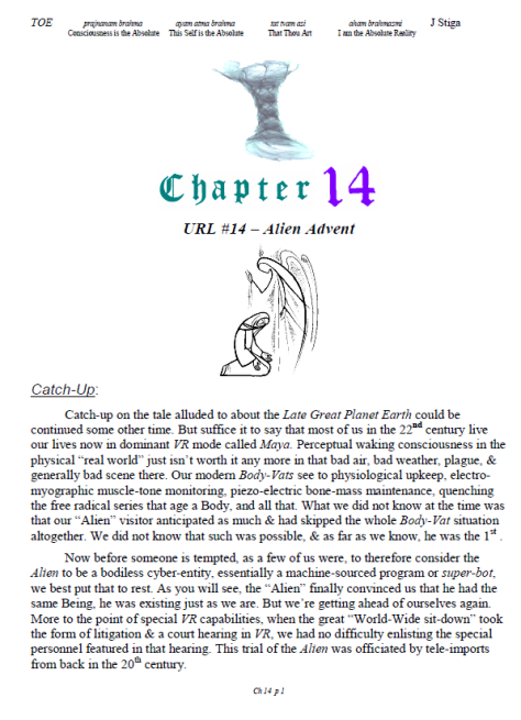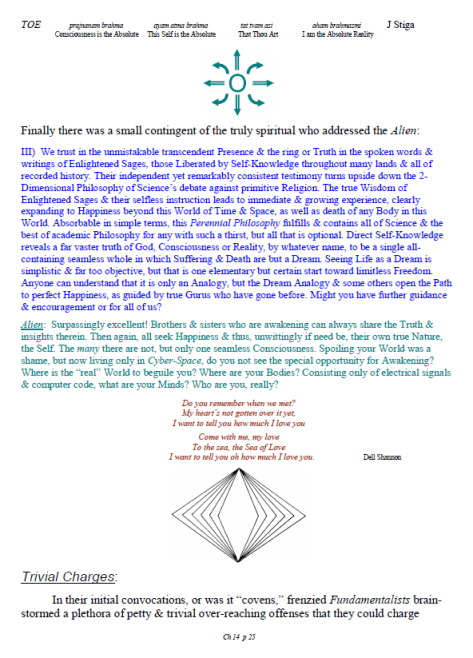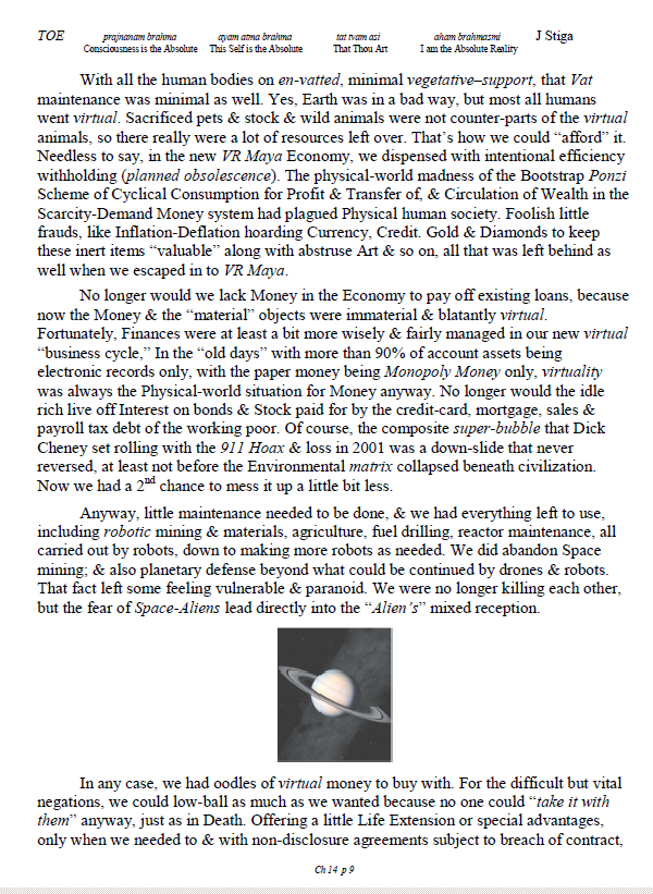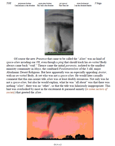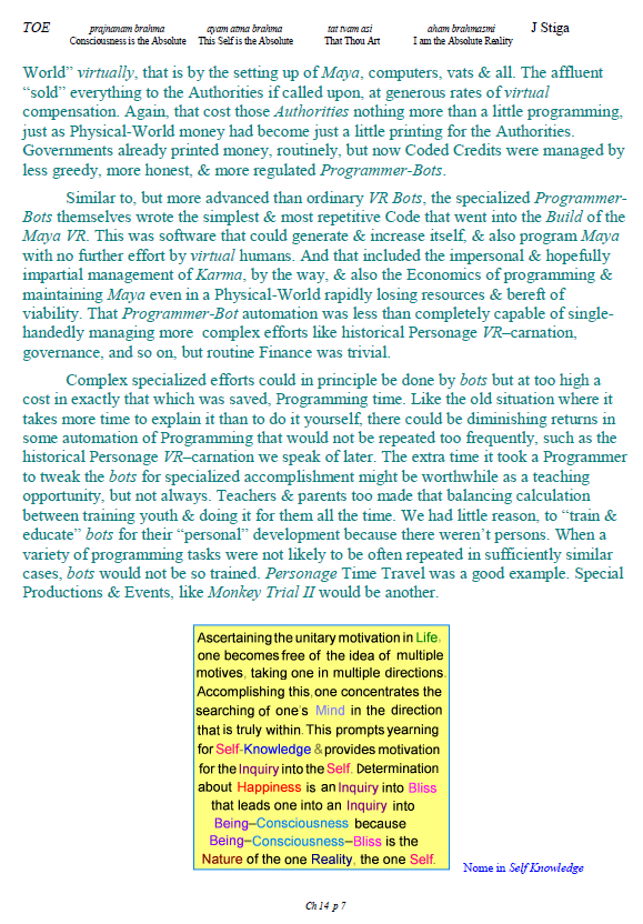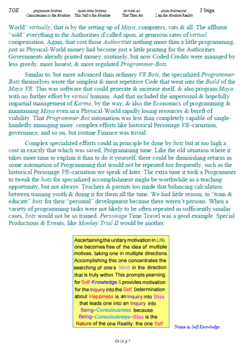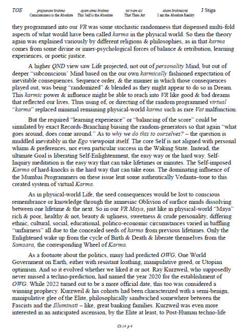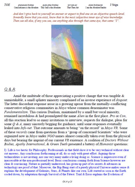 [A brief note of explanation – this Blog is entitled “Non-Duality & Science”, & so the more Science oriented pages (from what I like to think of as a “comic book”) have been posted there, while other chapters have been posted in the other Blog noted below. Science is a mental discipline that attracts some worthy admirers & participators. Some of these, too few, are good prospects for the ancient teaching introduced here in many ways. Otherwise certain Science topics like the Anthropic Principle, reinforce the general Theism which is a good idea in this materialistic age. A few other topics in Science, such as the Copenhagen II – Max Born – Von Neumann – Wigner model of Quantum Mechanics, are worthy entries to the extent that they introduce Consciousness into the physical Sciences. All that aside, the real topic here is the pinnacle as Advaita Vedanta, Non-Duality – that pinnacle being Ajata Vada, No–Creation. The great Teachers of the same include Sri Shankara & Sri Ramana Maharshi. Both would support Theism in general & adaptations of Vedanta, such as Vishishtadvaita Vedanta – Qualified Non-Duality, for those not making headway in Ajata Vada, their present course of growth might be better served with a temporary involvement in Qualified Non-Duality. The scientist who perhaps best expresses the influence of Qualified Non-Duality in Science, for instance, would be the quintessential “New–Age” Quantum Physicist, Amit Goswami. And so to that source, & the Quantum Activism he currently advocates [with a 1–course degree program], along with more than a half-dozen good books & former participation in the controversial What the Bleep movie, to him I extend enthusiastic endorsement, for that Qualified Non-Duality described in the context of Science. I do not stand so much “with him”, as much as nearby saluting his good work. Again, as here, a goal is inserting Consciousness into Science & “saving the World.”]